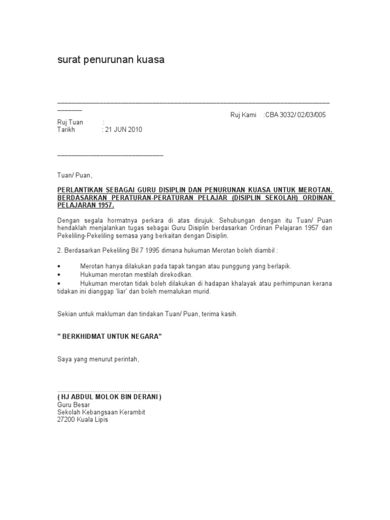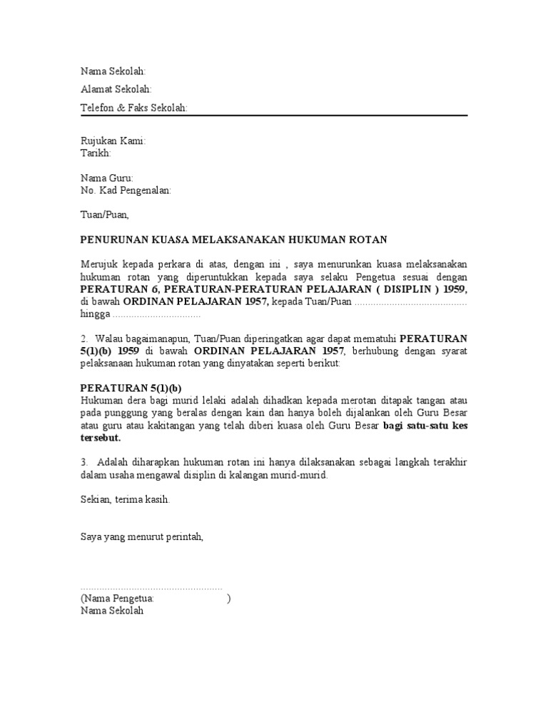 Contoh surat penurunan kuasa merotan. Berhubung perkara tersebut diatas dinyatakan bahawa dengan kuasa yang diberikan kepada saya sepertimana dalam Peraturan 4 dan 5 dalam Peraturan-Peraturan Pendidikan Persatuan Sekolah 1998 Akta Pendidikan 1996 seperti dalam Warta Kerajaan Malaysia Jilid 42 No. BERDASARKAN PERATURAN-PERATURAN PELAJAR DISIPLIN SEKOLAH ORDINAN PELAJARAN 1957.