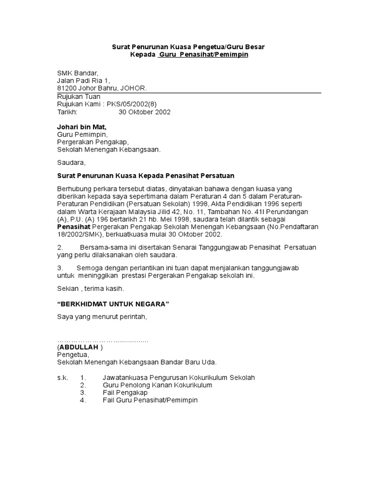 Contoh Surat Penurunan Kuasa Pengetua Pengakap Otosection